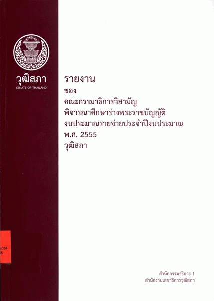รายงานของคณะกรรมาธิการวิสามัญพิจารณาศึกษาร่างพระราชบัญญัติงบประมาณรายจ่ายประจำปีงบประมาณ พ.ศ. 2555 วุฒิสภา / สำนักกรรมาธิการ 1 สำนักงานเลขาธิการวุฒิสภา.