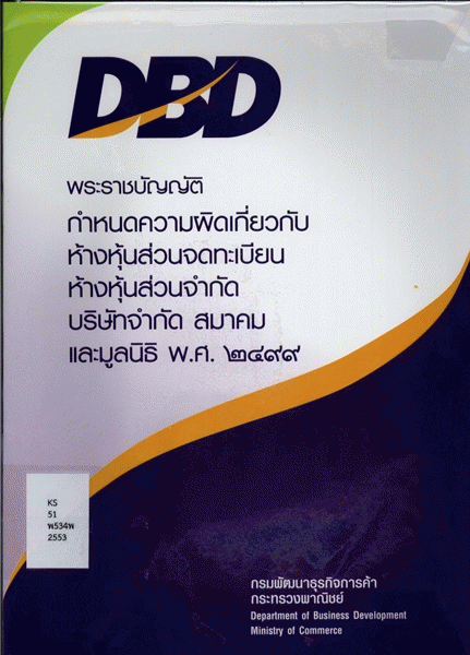 พระราชบัญญัติกำหนดความผิดเกี่ยวกับห้างหุ้นส่วนจดทะเบียน ห้างหุ้นส่วนจำกัด บริษัทจำกัด สมาคม และมูลนิธิ พ.ศ. 2499 / กรมพัฒนาธุรกิจการค้า กระทรวงพาณิชย์.