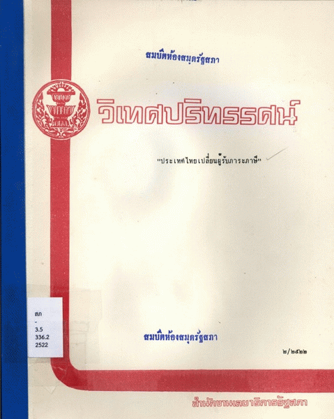 National Assembly Library of Thailand | Government Publications collection | Government Publication shelves | สภ - 3.5 336.2 2522 (เรียกดูชั้นหนังสือ(เปิดด้านล่าง)) | พร้อมให้บริการ | 3961187591 |