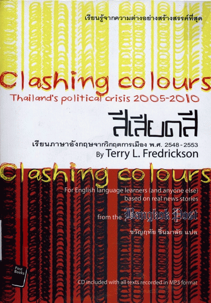 สีเสียดสี เรียนภาษาอังกฤษจากวิกฤตการเมือง พ.ศ.2548-2553 : Clashing colours : Thailand's political crisis 2005-2010 / Terry L. Fredrickson ; ขวัญฤทัย ชิ้นมาลัย แปล.