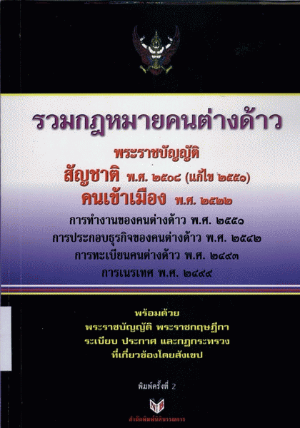 รวมกฎหมายคนต่างด้าว พระราชบัญญัติสัญชาติ พ.ศ. 2508 (แก้ไข 2551) คนเข้าเมือง พ.ศ. 2522... / บุญทรง พฤกษาพงษ์.