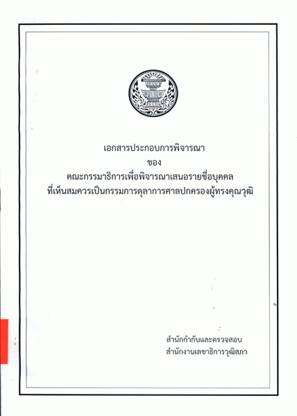 เอกสารประกอบการพิจารณาของคณะกรรมาธิการเพื่อพิจารณาเสนอรายชื่อบุคคลที่เห็นสมควรเป็นกรรมการตุลาการศาลปกครองผู้ทรงคุณวุฒิ / สำนักกำกับและตรวจสอบ สำนักงานเลขาธิการวุฒิสภา.