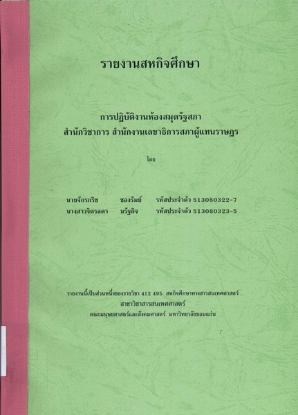 การปฏิบัติงานห้องสมุดรัฐสภา สำนักวิชาการ สำนักงานเลขาธิการสภาผู้แทนราษฎร / จิตรลดา นรัฐกิจ.