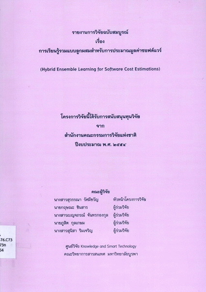 การเรียนรู้รวมแบบลูกผสมสำหรับการประมาณมูลค่าซอฟต์แวร์ สุวรรณา รัศมีขวัญ, กฤษณะ ชินสาร, เบญจภรณ์ จันทรกองกุล, ภูสิต กุลเกษม, สุนิสา ริมเจริญ.