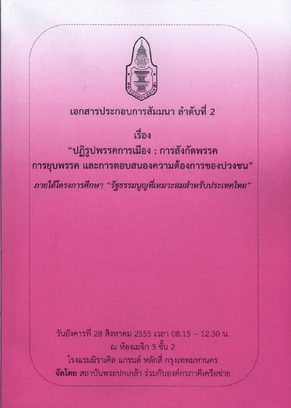 เอกสารประกอบการสัมมนา ลำดับที่ 2 เรื่อง "ปฏิรูปพรรคการเมือง : การสังกัดพรรค การยุบพรรค และการตอบสนองความต้องการของปวงชน" ภายใต้โครงการศึกษา "รัฐธรรมนูญที่เหมาะสมสำหรับประเทศไทย" / สถาบันพระปกเกล้า.