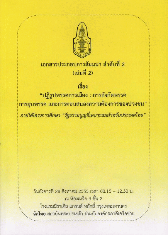เอกสารประกอบการสัมมนา ลำดับที่ 2 (เล่มที่ 2) เรื่อง "ปฏิรูปพรรคการเมือง : การสังกัดพรรค การยุบพรรค และการตอบสนองความต้องการของปวงชน" ภายใต้โครงการศึกษา "รัฐธรรมนูญที่เหมาะสมสำหรับประเทศไทย" / สถาบันพระปกเกล้า.