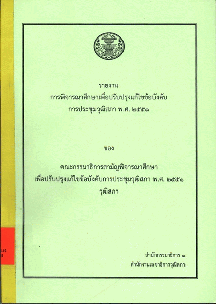 National Assembly Library of Thailand | Parliamentary Publications Collection | Parliamentary Publications Shelves | สว 09 7.3 328.31 2551 (เรียกดูชั้นหนังสือ(เปิดด้านล่าง)) | พร้อมให้บริการ | 3961190178 |