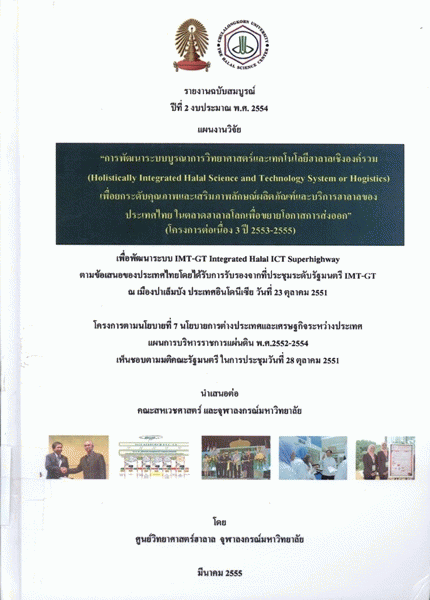 การพัฒนาระบบบูรณาการวิทยาศาสตร์และเทคโนโลยีฮาลาลเชิงองค์รวมเพื่อยกระดับคุณภาพและเสริมภาพลักษณ์ผลิตภัณฑ์และบริการฮาลาลของประเทศไทยในตลาดฮาลาลโลกเพื่อขยายโอกาสการส่งออก (โครงการต่อเนื่อง 3 ปี พ.ศ. 2553-2555) / ศูนย์วิทยาศาสตร์ฮาลาล จุฬาลงกรณ์มหาวิทยาลัย.