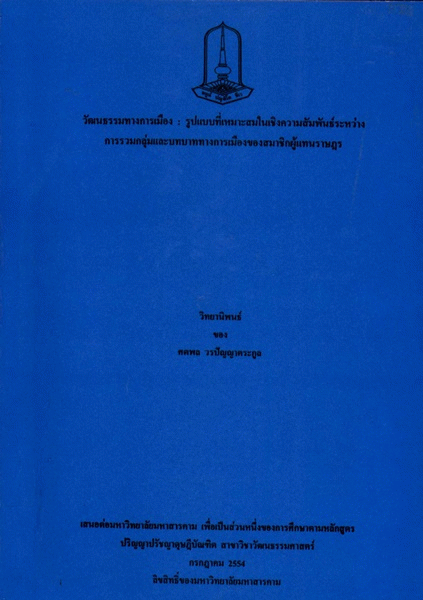 วัฒนธรรมทางการเมือง : รูปแบบที่เหมาะสมในเชิงความสัมพันธ์ระหว่างการรวมกลุ่มและบทบาททางการเมืองของสมาชิกผู้แทนราษฎร / ศตพล วรปัญญาตระกูล.