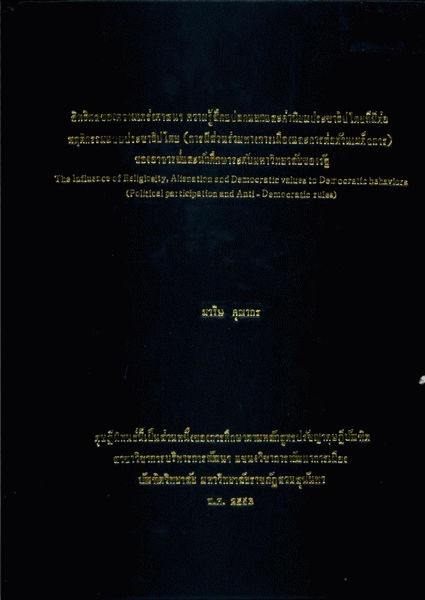 อิทธิพลของความเคร่งศาสนา ความรู้สึกแปลกแยก และค่านิยมประชาธิปไตยที่มีต่อพฤติกรรมแบบประชาธิปไตย (การมีส่วนร่วมทางการเมือง และการต่อต้านเผด็จการ) ของอาจารย์และนักศึกษาระดับมหาวิทยาลัยของรัฐ / มาริษ คุณากร.