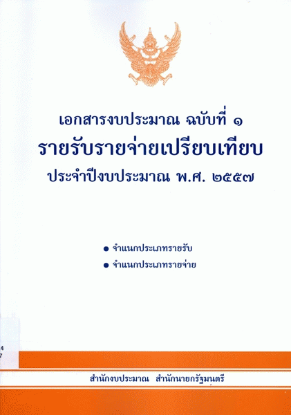 เอกสารงบประมาณ ฉบับที่ 1 รายรับรายจ่ายเปรียบเทียบ ประจำปีงบประมาณ พ.ศ. 2557 จำแนกประเภทรายรับ จำแนกประเภทรายจ่าย / สำนักงบประมาณ.