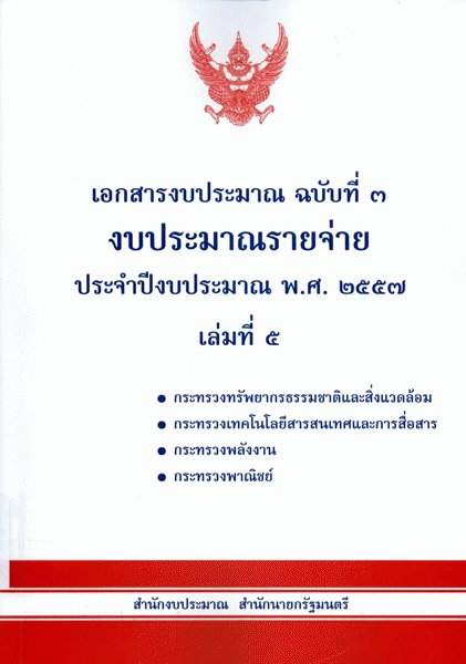 เอกสารงบประมาณ ฉบับที่ 3 งบประมาณรายจ่าย ประจำปีงบประมาณ พ.ศ. 2557 เล่มที่ 5 กระทรวงทรัพยากรธรรมชาติและสิ่งแวดล้อม กระทรวงเทคโนโลยีสารสนเทศและการสื่อสาร กระทรวงพลังงาน กระทรวงพาณิชย์ / สำนักงบประมาณ.