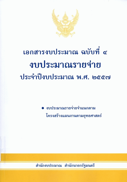 เอกสารงบประมาณ ฉบับที่ 4 งบประมาณรายจ่าย ประจำปีงบประมาณ พ.ศ. 2557 งบประมาณรายจ่ายจำแนกตามโครงสร้างแผนงานตามยุทธศาสตร์ / สำนักงบประมาณ.