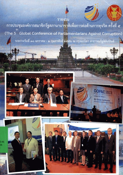รายงานการประชุมองค์การสมาชิกรัฐสภานานาชาติเพื่อการต่อต้านการทุจริต ครั้งที่ 5 (The 5th Global Conference of Parliamentarians Against Corruption) ระหว่างวันที่ 30 มกราคม - 2 กุมภาพันธ์ 2556 ณ กรุงมะนิลา สาธารณรัฐฟิลิปปินส์ / กลุ่มงานสหภาพสมาชิกรัฐสภาเอเซียและแปซิฟิก สำนักองค์การรัฐสภาระหว่างประเทศ สำนักงานเลขาธิการสภาผู้แทนราษฎร.