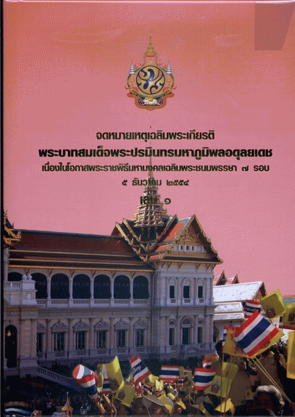 จดหมายเหตุเฉลิมพระเกียรติพระบาทสมเด็จพระปรมินทรมหาภูมิพลอดุลยเดช เนื่องในโอกาสพระราชพิธีมหามงคลเฉลิมพระชนมพรรษา 7 รอบ 5 ธันวาคม 2554 เล่ม 1 / กรมศิลปากร.
