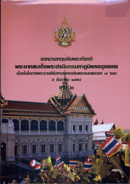 จดหมายเหตุเฉลิมพระเกียรติพระบาทสมเด็จพระปรมินทรมหาภูมิพลอดุลยเดช เนื่องในโอกาสพระราชพิธีมหามงคลเฉลิมพระชนมพรรษา 7 รอบ 5 ธันวาคม 2554 เล่ม 2 / กรมศิลปากร.