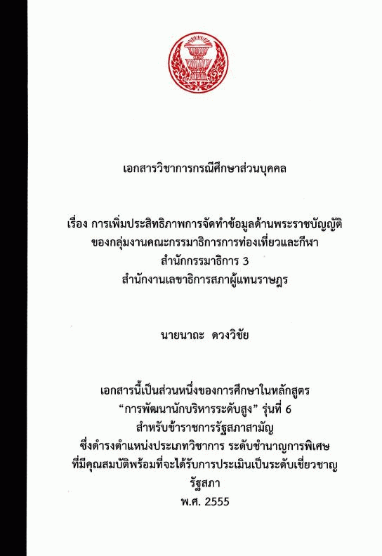 การเพิ่มประสิทธิภาพการจัดทำข้อมูลด้านพระราชบัญญัติของกลุ่มงานคณะกรรมาธิการการท่องเที่ยวและกีฬา สำนักกรรมาธิการ 3 สำนักงานเลขาธิการสภาผู้แทนราษฎร / นาถะ ดวงวิชัย.
