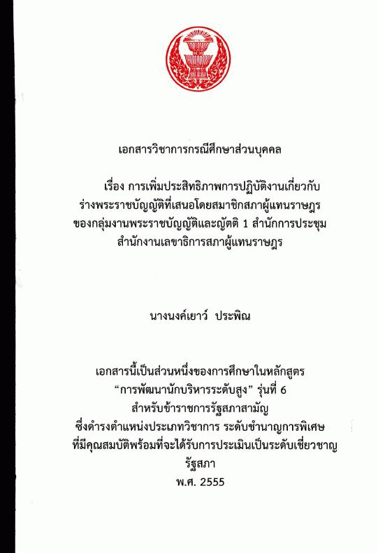 การเพิ่มประสิทธิภาพการปฏิบัติงานเกี่ยวกับร่างพระราชบัญญัติที่เสนอโดยสมาชิกสภาผู้แทนราษฎรของกลุ่มงานพระราชบัญญัติและญัตติ 1 สำนักการประชุม สำนักงานเลขาธิการสภาผู้แทนราษฎร / นงค์เยาว์ ประพิณ.