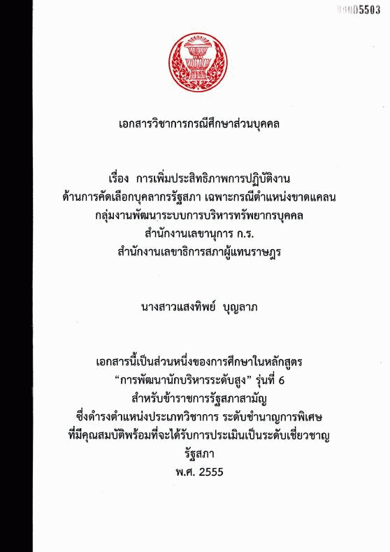 การเพิ่มประสิทธิภาพการปฏิบัติงานด้านการคัดเลือกบุคลากรรัฐสภา เฉพาะกรณีตำแหน่งขาดแคลน กลุ่มงานพัฒนาระบบการบริหารทรัพยากรบุคคล สำนักงานเลขานุการ ก.ร. สำนักงานเลขาธิการสภาผู้แทนราษฎร / แสงทิพย์ บุญลาภ.
