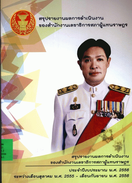 สรุปรายงานผลการดำเนินงานของสำนักงานเลขาธิการสภาผู้แทนราษฎร ประจำปีงบประมาณ พ.ศ. 2556 ระหว่างเดือนตุลาคม พ.ศ. 2555 - เดือนกันยายน พ.ศ. 2556 / สำนักนโยบายและแผน สำนักงานเลขาธิการสภาผู้แทนราษฎร.