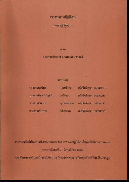 รายงานการปฏิบัติงานหอสมุดรัฐสภา พรพิมล โตเหมือน, พิชฌน์รัชน์ เสวันนา, ศุจินธร สุรวัฒน์เดชา, สุรวัฒน์เดชา ขันธมาลา.
