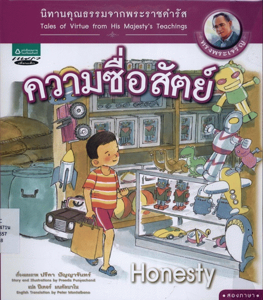 นิทานคุณธรรมจากพระราชดำรัส : ความซื่อสัตย์ = Tales of virtue from His Majesty's teachings : honesty / เรื่องและภาพ ปรีดา ปัญญาจันทร์ ; แปล ปีเตอร์ มนตัลบาโน.