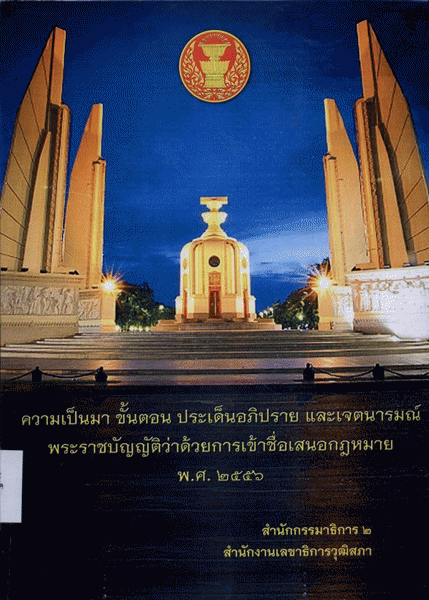 ความเป็นมา ขั้นตอน ประเด็นอภิปราย และเจตนารมณ์พระราชบัญญัติว่าด้วยการเข้าชื่อเสนอกฎหมาย พ.ศ. 2556 / กลุ่มงานคณะกรรมาธิการวิสามัญ 3 สำนักกรรมาธิการ 2 สำนักงานเลขาธิการวุฒิสภา.