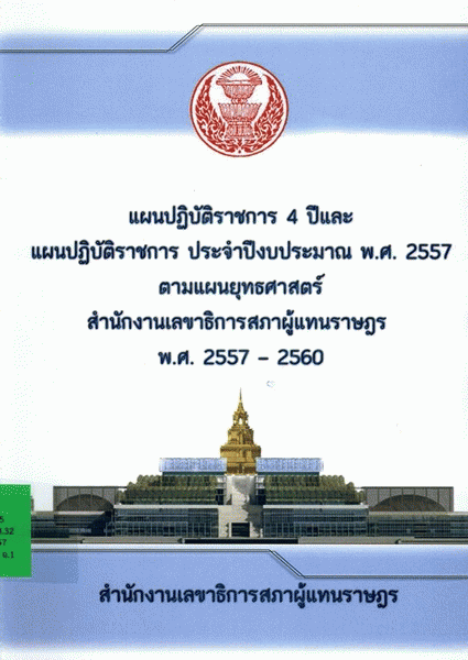 แผนปฏิบัติราชการ 4 ปีและแผนปฏิบัติราชการ ประจำปีงบประมาณ พ.ศ. 2557 ตามแผนยุทธศาสตร์สำนักงานเลขาธิการสภาผู้แทนราษฎร พ.ศ. 2557 - 2560 / สำนักนโยบายและแผน สำนักงานเลขาธิการสภาผู้แทนราษฎร.
