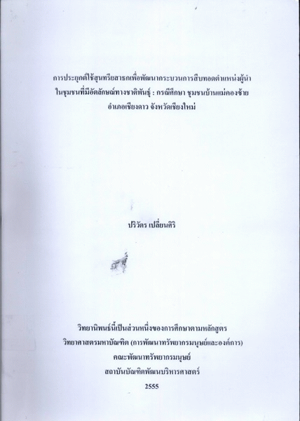 การประยุกต์ใช้สุนทรียสาธกเพื่อพัฒนากระบวนการสืบทอดตำแหน่งผู้นำในชุมชนที่มีอัตลักษณ์ทางชาติพันธุ์ : กรณีศึกษาชุมชนบ้านแม่คองซ้าย อำเภอเชียงดาว จังหวัดเชียงใหม่ / ปริวัตร เปลี่ยนศิริ.