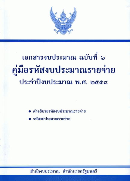 เอกสารงบประมาณ ฉบับที่ 6 คู่มือรหัสงบประมาณรายจ่าย ประจำปีงบประมาณ พ.ศ. 2558 คำอธิบายรหัสงบประมาณรายจ่าย รหัสงบประมาณรายจ่าย / สำนักงบประมาณ.