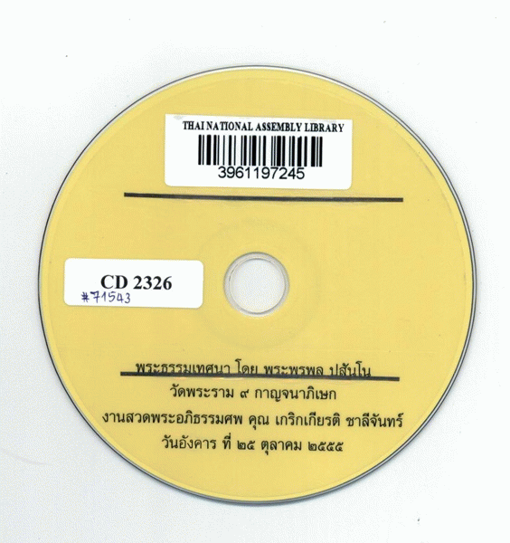 National Assembly Library of Thailand | Audio-Visual Materials collection | CD 2326 (เรียกดูชั้นหนังสือ(เปิดด้านล่าง)) | พร้อมให้บริการ | 3961197245 |
