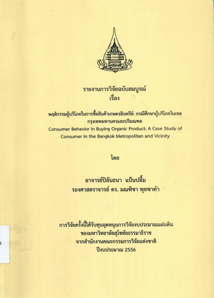 พฤติกรรมผู้บริโภคในการซื้อสินค้าเกษตรอินทรีย์ : กรณีศึกษาผู้บริโภคในเขตกรุงเทพมหานครและปริมณฑล / ปิลันธนา แป้นปลื้ม, มณฑิชา พุทซาคำ.