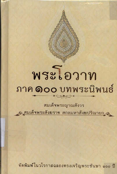 พระโอวาท ภาค 100 บทพระนิพนธ์ สมเด็จพระญาณสังวร สมเด็จพระสังฆราช สกลมหาสังฆปริณายก / สมเด็จพระญาณสังวร สมเด็จพระสังฆราช สกลมหาสังฆปริณายก.