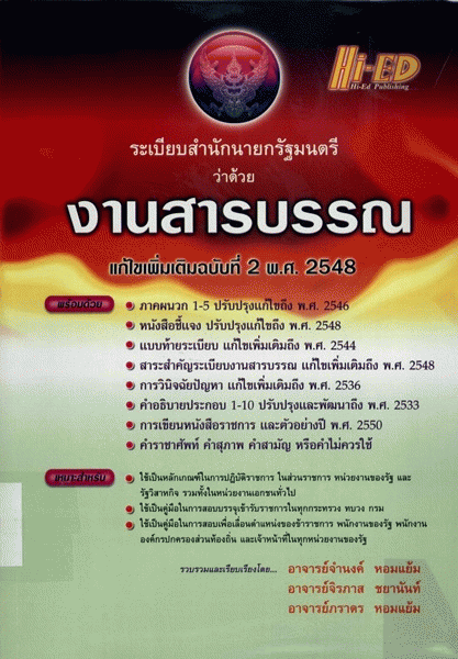 ระเบียบสำนักนายกรัฐมนตรีว่าด้วยงานสารบรรณ แก้ไขเพิ่มเติมฉบับที่ 2 พ.ศ. 2548 / จำนงค์ หอมแย้ม, จิรภาส ชยานันท์, ภราดร หอมแย้ม.