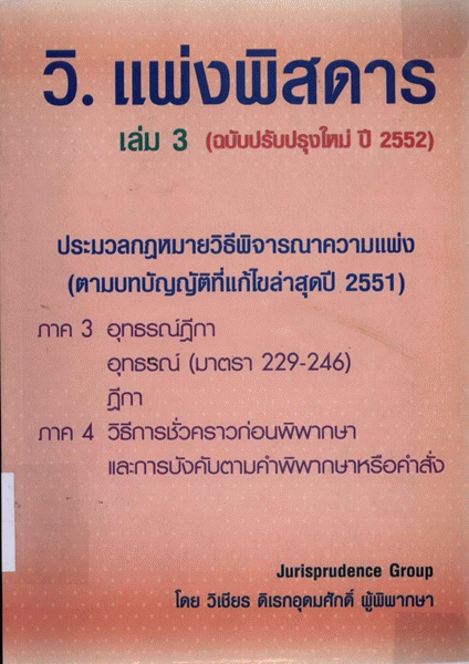 - วิ.แพ่งพิสดาร เล่ม 3 (ฉบับปรับปรุงใหม่ ปี 2552) ประมวลกฎหมายวิธีพิจารณาความแพ่ง (ตามบทบัญญัติที่แก้ไขล่าสุดปี 2551) ภาค 3 อุทธรณ์ฎีกา อุทธรณ์ (มาตรา 229-246) ฎีกา ภาค 4 วิธีการชั่วคราวก่อนพิพากษา และการบังคับตามคำพิพากษาหรือคำสั่ง [Cover title]