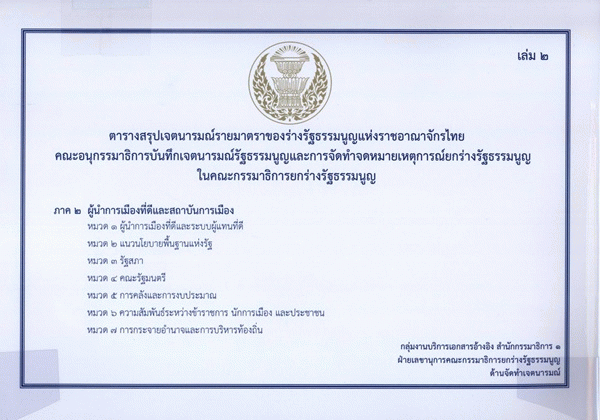 ตารางสรุปเจตนารมณ์รายมาตราของร่างรัฐธรรมนูญแห่งราชอาณาจักรไทย คณะอนุกรรมาธิการบันทึกเจตนารมณ์รัฐธรรมนูญและการจัดทำจดหมายเหตุการณ์ร่างรัฐธรรมนูญในคณะกรรมาธิการยกร่างรัฐธรรมนูญ เล่ม 2 / ฝ่ายเลขานุการคณะกรรมาธิการยกร่างรัฐธรรมนูญ สำนักกรรมาธิการ 3. สำนักงานเลขาธิการสภาผู้แทนราษฎร.