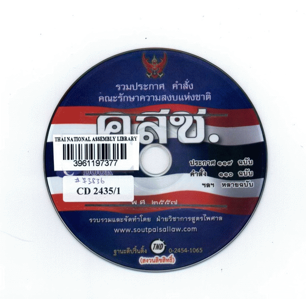 National Assembly Library of Thailand | Audio-Visual Materials collection | Audio-Visual zone | CD 2435/1 (เรียกดูชั้นหนังสือ(เปิดด้านล่าง)) | ฉ.1 | พร้อมให้บริการ | 3961197377 |