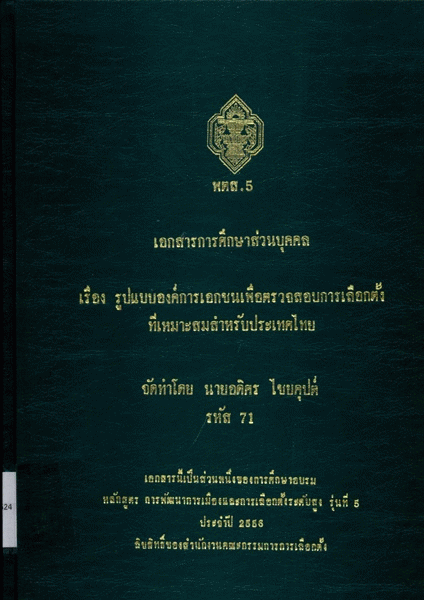 รูปแบบองค์การเอกชนเพื่อตรวจสอบการเลือกตั้งที่เหมาะสมสำหรับประเทศไทย / อดิศร ไชยคุปต์.