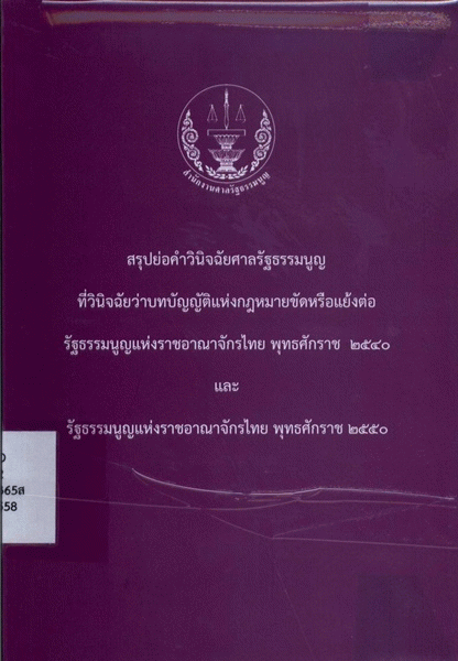 สรุปย่อคำวินิจฉัยศาลรัฐธรรมนูญที่วินิจฉัยว่าบทบัญญัติแห่งกฎหมายขัดหรือแย้งต่อรัฐธรรมนูญแห่งราชอาณาจักรไทย พุทธศักราช 2540 และรัฐธรรมนูญแห่งราชอาณาจักรไทย พุทธศักราช 2550 / สำนักงานศาลรัฐธรรมนูญ.