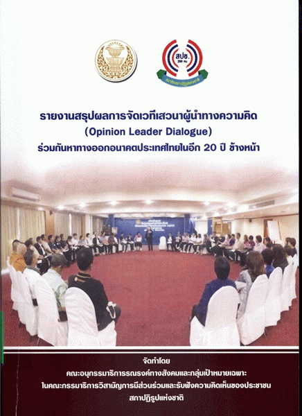รายงานสรุปผลการจัดเวทีเสวนาผู้นำทางความคิด (Opinion Leader Dialogue) ร่วมกันหาทางออกอนาคตประเทศไทยในอีก 20 ปี ข้างหน้า / สำนักงานเลขาธิการสภาผู้แทนราษฎร ปฏิบัติหน้าที่สำนักงานเลขาธิการสภาปฏิรูปแห่งชาติ.