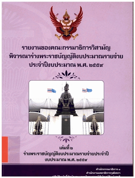 รายงานของคณะกรรมาธิการวิสามัญพิจารณาร่างพระราชบัญญัติงบประมาณรายจ่าย ประจำปีงบประมาณ พ.ศ.2559 เล่มที่ 2 ร่างพระราชบัญญัติงบประมาณรายจ่ายประจำปีงบประมาณ พ.ศ.2559 / สำนักกรรมาธิการ 1 สำนักงานเลขาธิการวุฒิสภา ปฏิบัติหน้าที่สำนักงานเลขาธิการสภานิติบัญญัติแห่งชาติ.