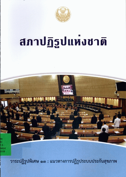 สภาปฏิรูปแห่งชาติ วาระปฏิรูปพิเศษ 13 : แนวทางการปฏิรูประบบประกันสุขภาพ / สำนักงานเลขาธิการสภาผู้แทนราษฎร ปฏิบัติหน้าที่สำนักงานเลขาธิการสภาปฏิรูปแห่งชาติ.
