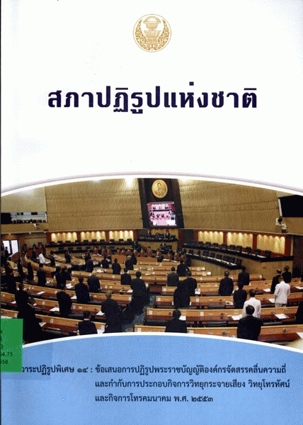 สภาปฏิรูปแห่งชาติ วาระปฏิรูปพิเศษ 14 : ข้อเสนอการปฏิรูปพระราชบัญญัติองค์กรจัดสรรคลื่นความถี่และกำกับการประกอบกิจการวิทยุกระจายเสียง วิทยุโทรทัศน์ และกิจการโทรคมนาคม พ.ศ. 2553 / สำนักงานเลขาธิการสภาผู้แทนราษฎร ปฏิบัติหน้าที่สำนักงานเลขาธิการสภาปฏิรูปแห่งชาติ.