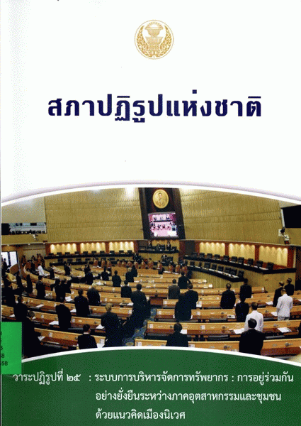 สภาปฏิรูปแห่งชาติ วาระปฏิรูปที่ 25 : ระบบการบริหารจัดการทรัพยากร : การอยู่ร่วมกันอย่างยั่งยืนระหว่างภาคอุตสาหกรรมและชุมชนด้วยแนวคิดเมืองนิเวศ / สำนักงานเลขาธิการสภาผู้แทนราษฎร ปฏิบัติหน้าที่สำนักงานเลขาธิการสภาปฏิรูปแห่งชาติ.
