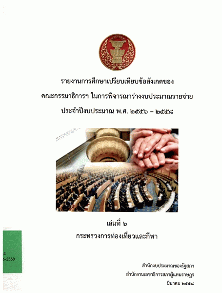 รายงานการศึกษาเปรียบเทียบข้อสังเกตของคณะกรรมาธิการฯ ในการพิจารณาร่างงบประมาณรายจ่าย ประจำปีงบประมาณ พ.ศ. 2556 - 2558 เล่มที่ 6 กระทรวงการท่องเที่ยวและกีฬา / สำนักงบประมาณของรัฐสภา สำนักงานเลขาธิการสภาผู้แทนราษฎร.