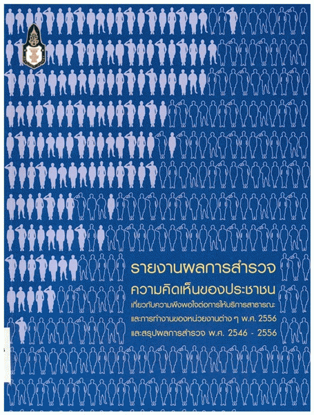 รายงานผลการสำรวจความคิดเห็นของประชาชนเกี่ยวกับความพึงพอใจต่อการให้บริการสาธารณะและการทำงานของหน่วยงานต่าง ๆ พ.ศ. 2556 และสรุปผลการสำรวจ พ.ศ. 2546 - 2556 / สถาบันพระปกเกล้า.