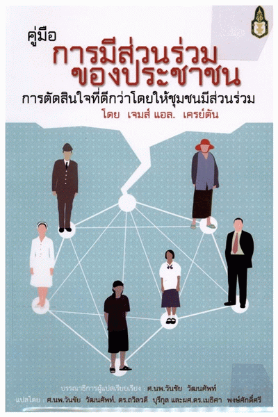 คู่มือการมีส่วนร่วมของประชาชน : การตัดสินใจที่ดีกว่าโดยให้ชุมชนมีส่วนร่วม = The public participation handbook : making better decisions through citizen involvement / โดย เจมส์ แอล. เครย์ตัน ; แปลโดย วันชัย วัฒนศัพท์, ถวิลวดี บุรีกุล และ เมธิศา พงษ์ศักดิ์ศรี ; บรรณาธิการผู้เรียบเรียง วันชัย วัฒนศัพท์.