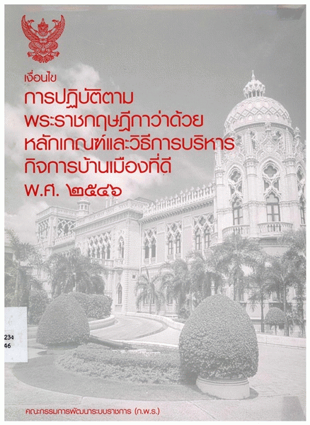 เงื่อนไขการปฏิบัติตามพระราชกฤษฎีกาว่าด้วยหลักเกณฑ์และวิธีการบริหารกิจการบ้านเมืองที่ดี พ.ศ. 2546 / คณะกรรมการพัฒนาระบบราชการ.