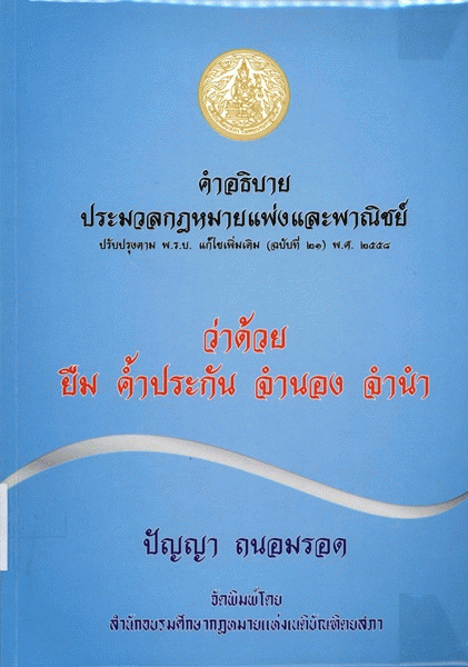 คำอธิบายประมวลกฎหมายแพ่งและพาณิชย์ ปรับปรุงตาม พ.ร.บ. แก้ไขเพิ่มเติม (ฉบับที่ 21) พ.ศ. 2558 ว่าด้วยยืม ค้ำประกัน จำนอง จำนำ / ปัญญา ถนอมรอด.