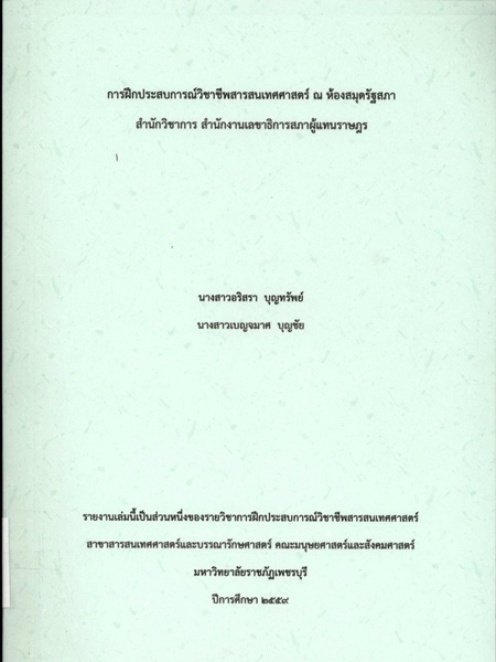 การฝึกประสบการณ์วิชาชีพสารสนเทศศาสตร์ ณ ห้องสมุดรัฐสภา สำนักวิชาการ สำนักงานเลขาธิการสภาผู้แทนราษฎร / อริสรา บุญทรัพย์, เบญจมาศ บุญชัย.